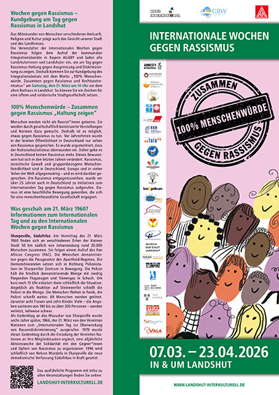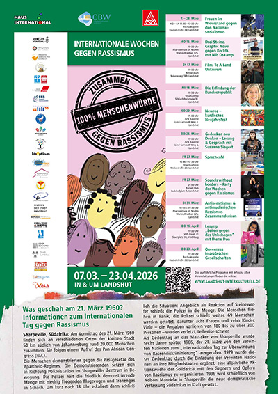 Die Veranstalter der Internationalen Wochen gegen Rassismus folgen dem Aufruf der kommunalen Integrationsbeiräte in Bayern AGABY und laden alle Landshuter*innen ein, am Tag gegen Rassismus Haltung gegen Ausgrenzung und Diskriminierung zu zeigen.